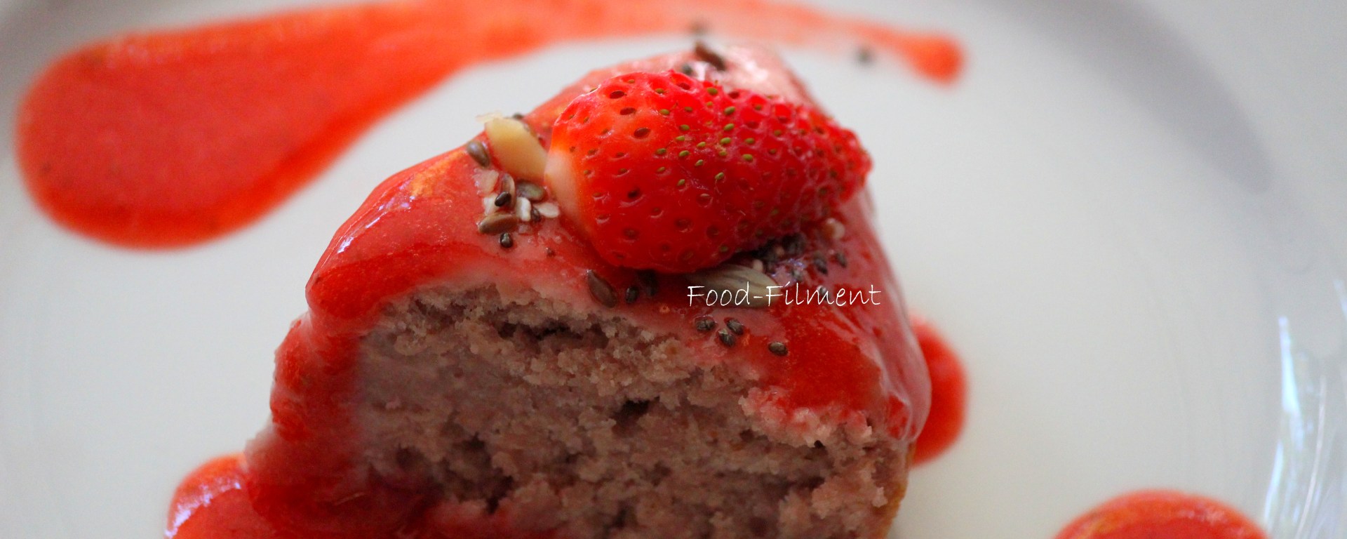 In a serving plate, place a piece of the cake and add the strawberry sauce on top. The sweetness of the cake with the tartness of the strawberry sauce is a heavenly combination.